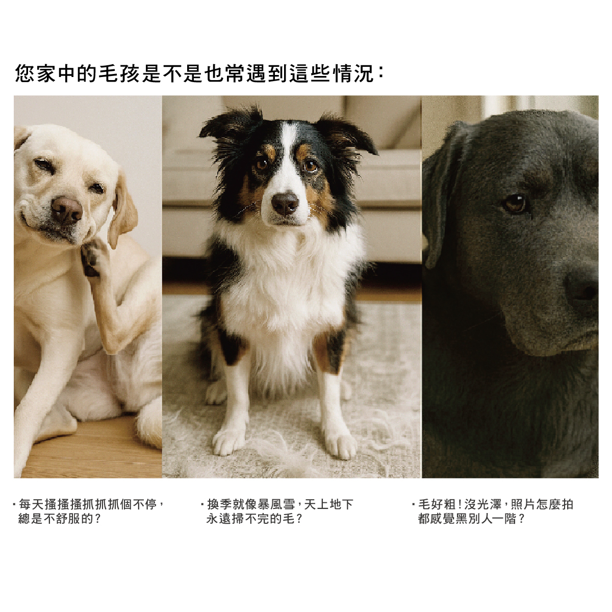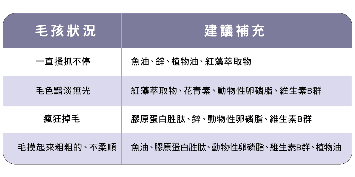 以下是針對常見毛孩皮膚與毛髮困擾,建議搭配的營養素組合: