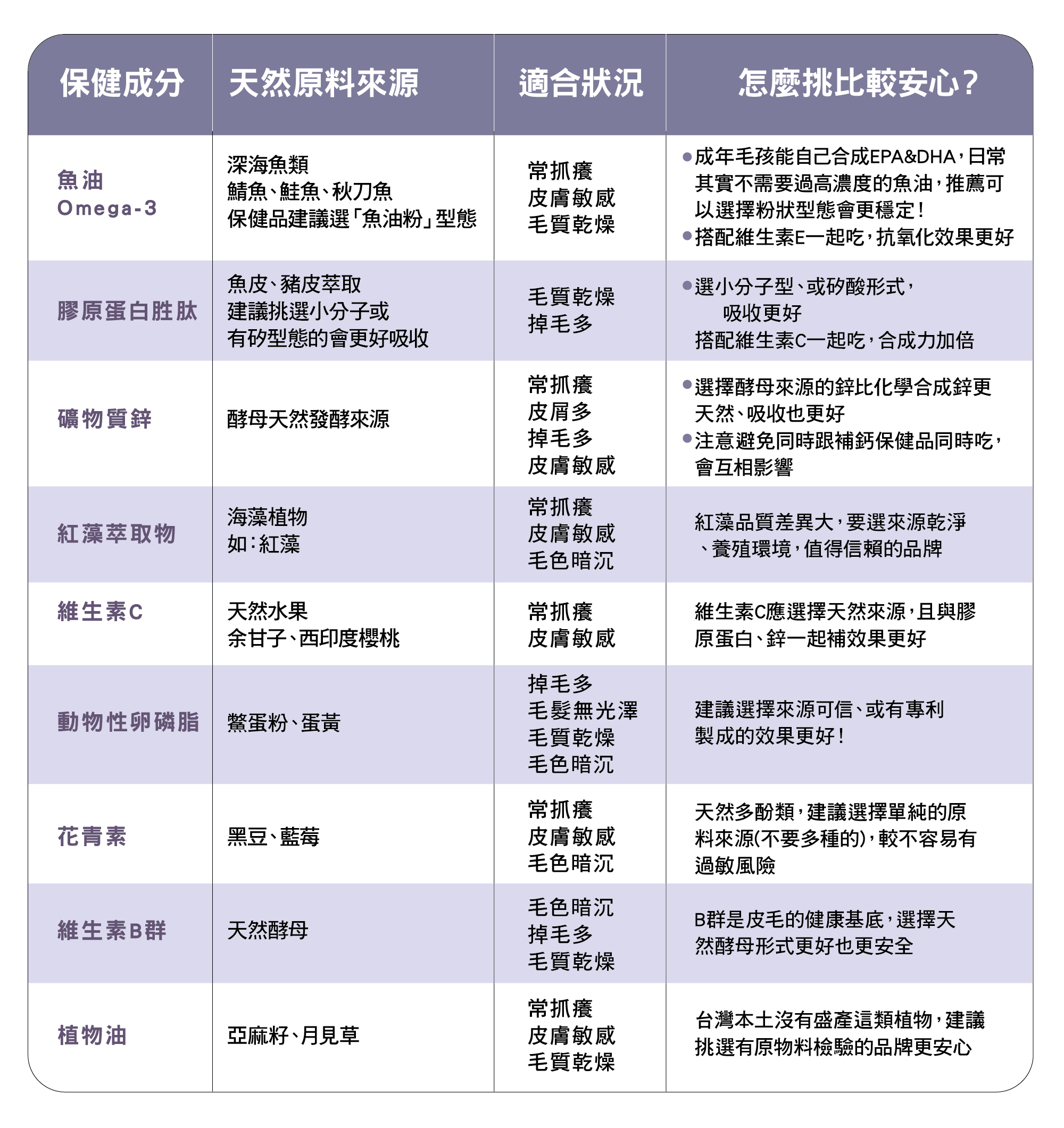 市面上的皮毛保健品琳瑯滿目,有的主打魚油、有的標榜膠原蛋白,也有各種複方、植物配方,到底該怎麼選才對?其實,每一個營養素的作用不同,針對的狀況也不一樣。以下是營養師為你整理的「皮膚&毛髮」必備營養素對照表,讓你看懂成分、補對方向: