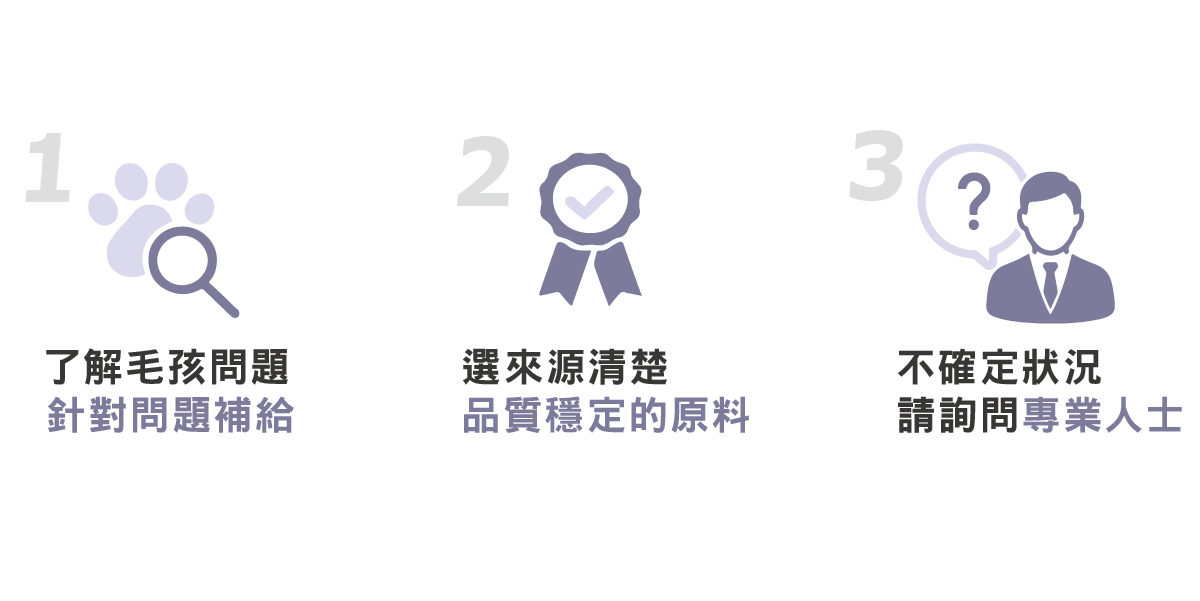 1. 選「有配方設計」的產品:由獸醫師或營養師設計的複方,比單一成分更能補對問題。2. 注重原料來源與品牌透明度:看得見產地與檢驗報告,才能確保品質。3. 適口性與方便性也很重要:挑嘴的貓咪狗狗也願意吃,爸媽才餵得輕鬆。
