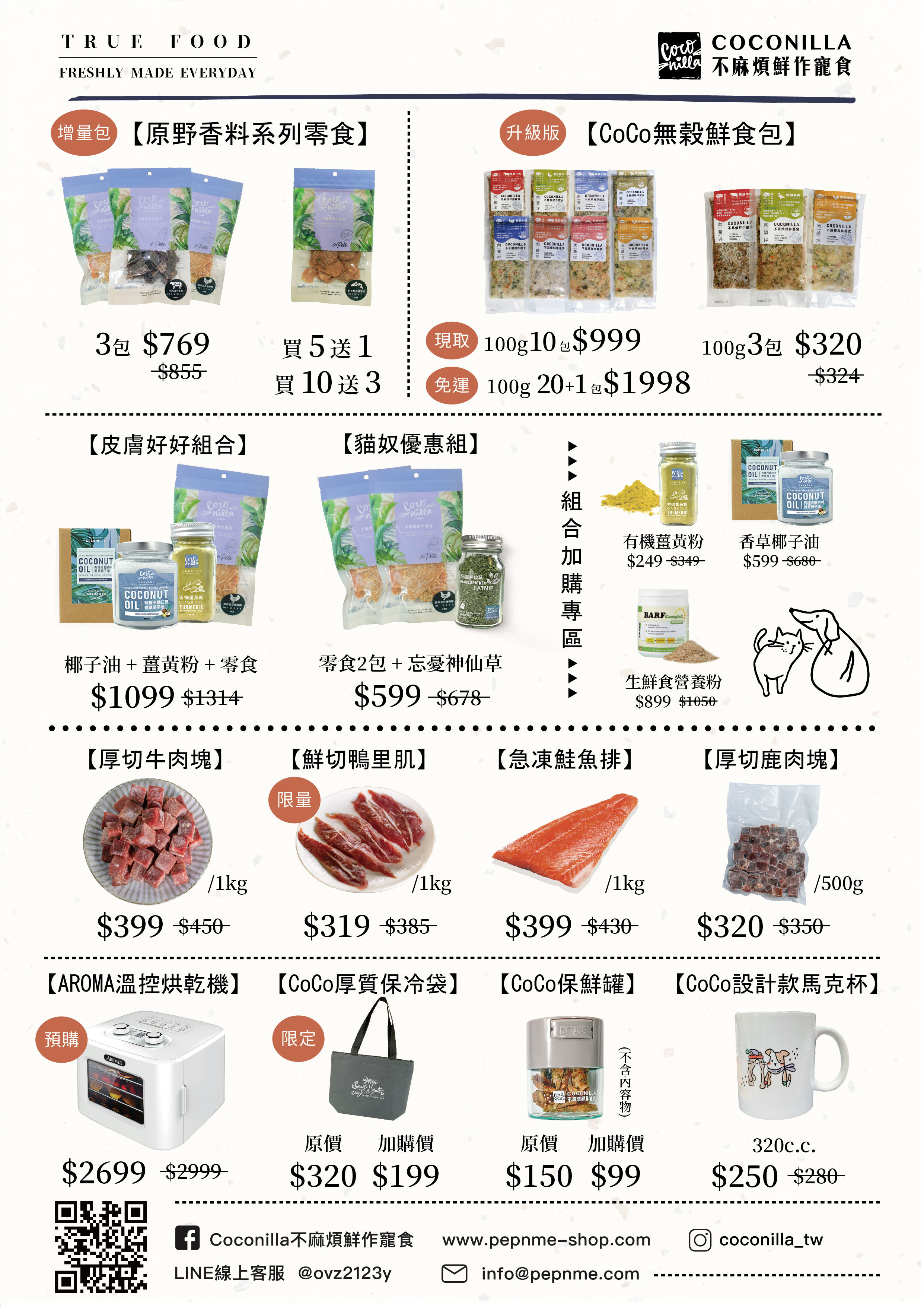 這次我們舉辦了線上寵物展!優惠組合商品任選滿NT$2000即可享有免運,未滿則需NT$100常溫宅配運費、NT$150冷凍宅配運費、NT$65超商常溫店到店、NT$160超商冷凍店到店。