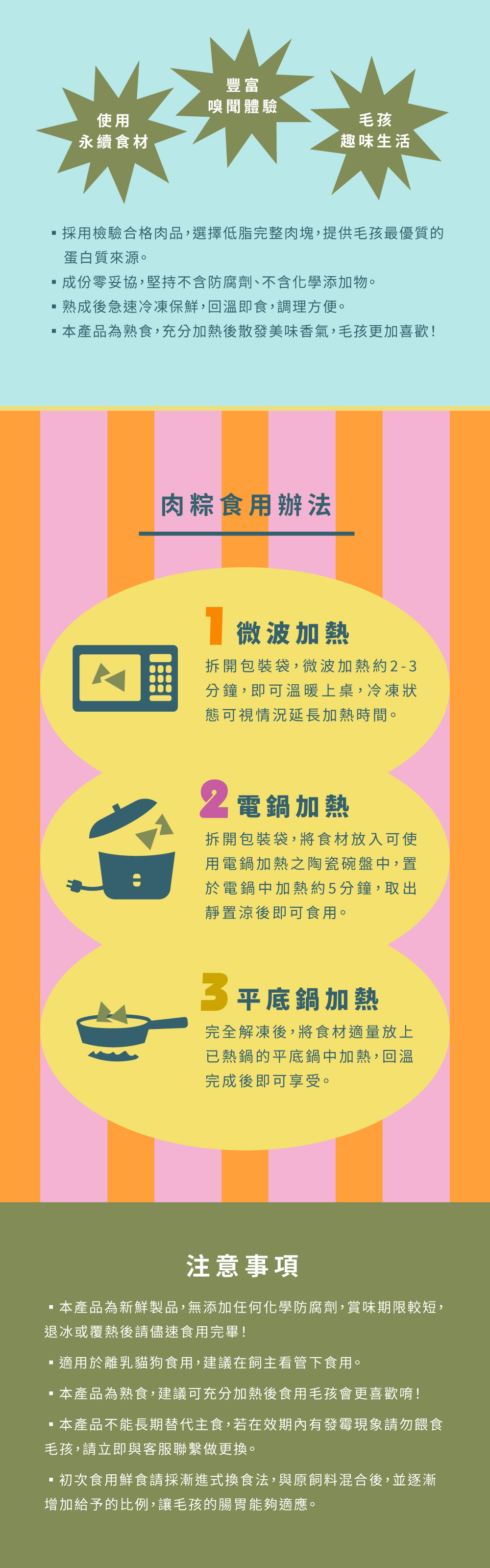 |使用方法|1微波加熱:完全解凍後,置於微波爐內加熱約2-3分鐘,即可溫暖上桌,冷凍狀態可視情況延長加熱時間。2電鍋加熱:完全解凍後,將食材放入可使用電鍋加熱之陶瓷碗盤中,置於電鍋中加熱約5分鐘,取出靜置涼後即可食用。3平底鍋加熱:完全解凍後,將食材適量放上已熱鍋的平底鍋中加熱,回溫完成後即可享受。* 加熱時間請根據需求調整,加熱後小心毛孩燙口